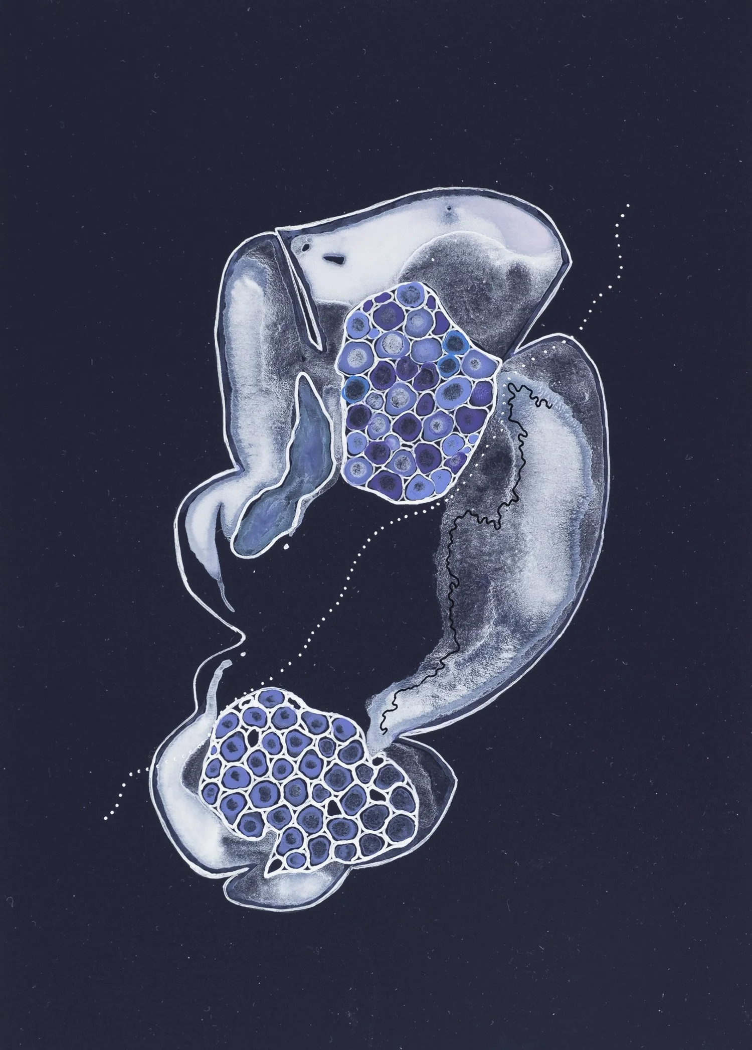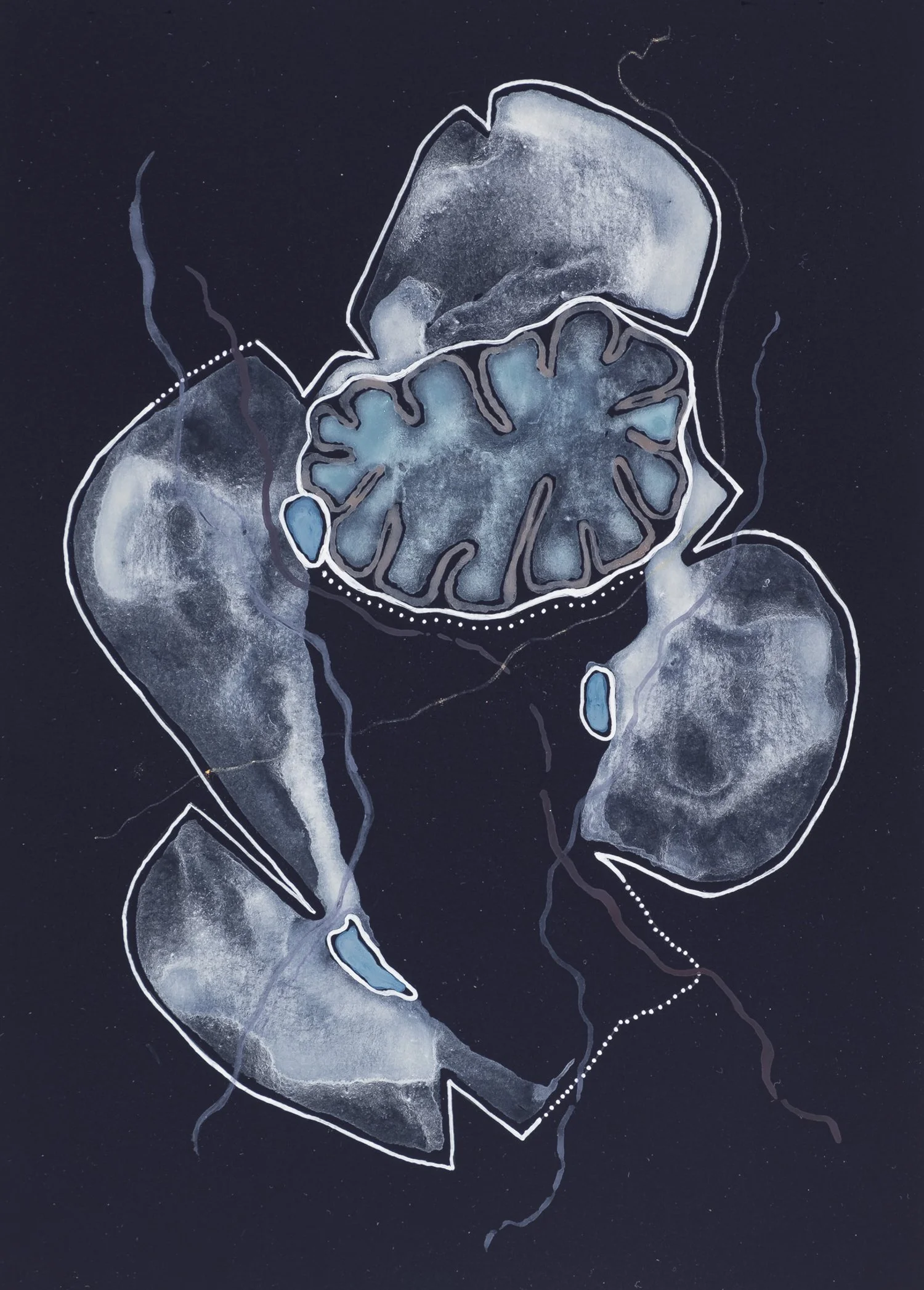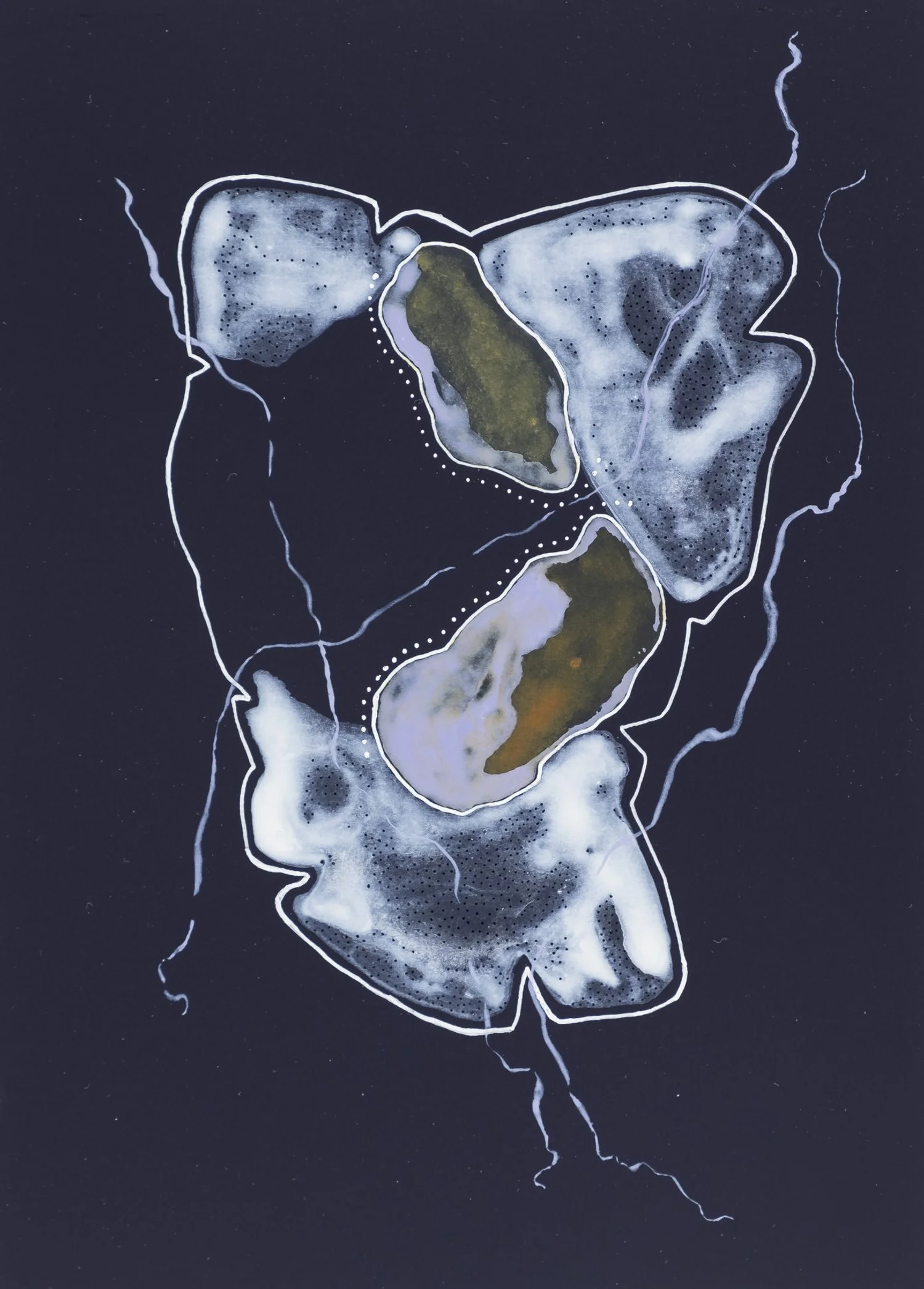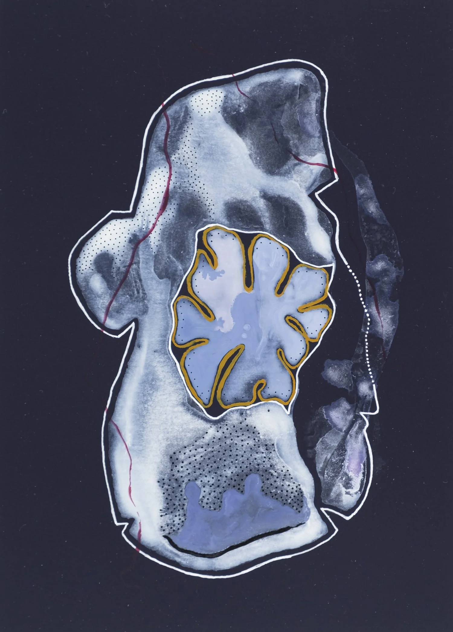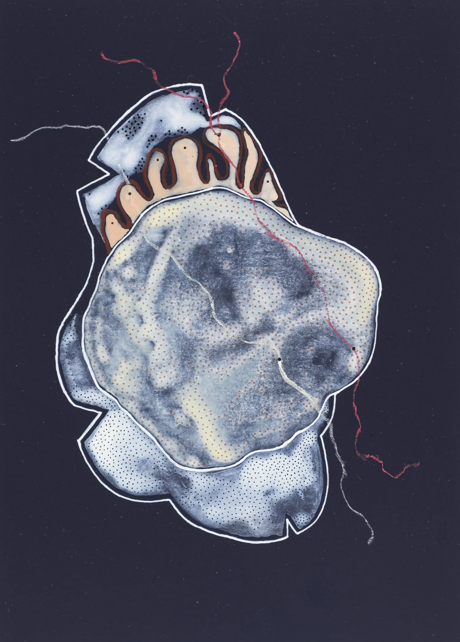 Jag intresserar mig framförallt för geologi och biologi. Avlägsna platser såsom havsbottnar, öar och glaciärer, men även kroppens inre organ och processer. Metoden är repetitiv men pennans linjer och trådens stygn är inte förutbestämda genom en skiss utan beslutas ofta allt eftersom verket tar form. Likt en utgrävning arbetar jag sakta fram former och berättelser.