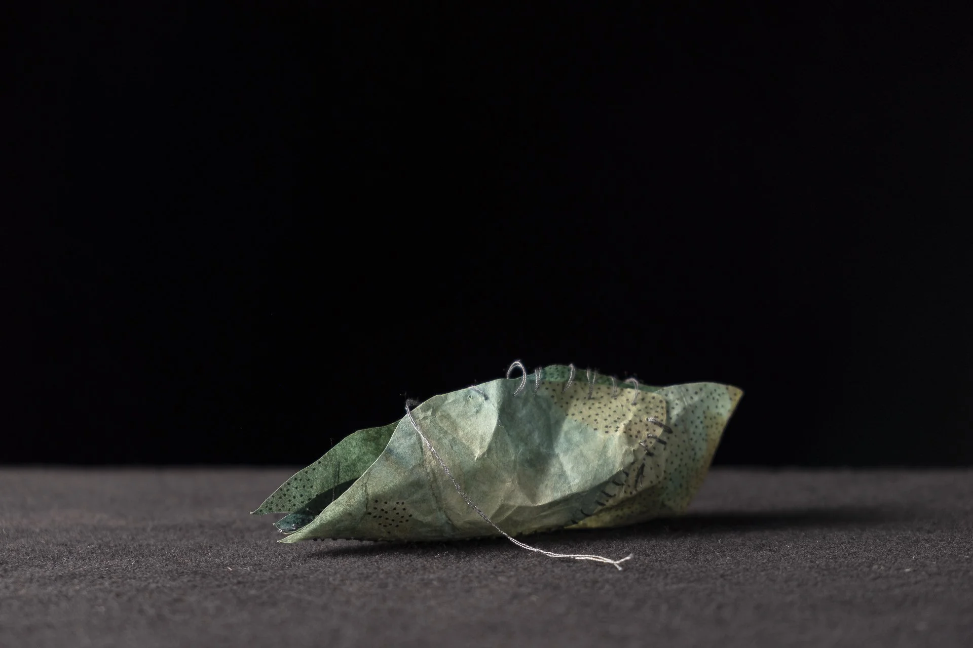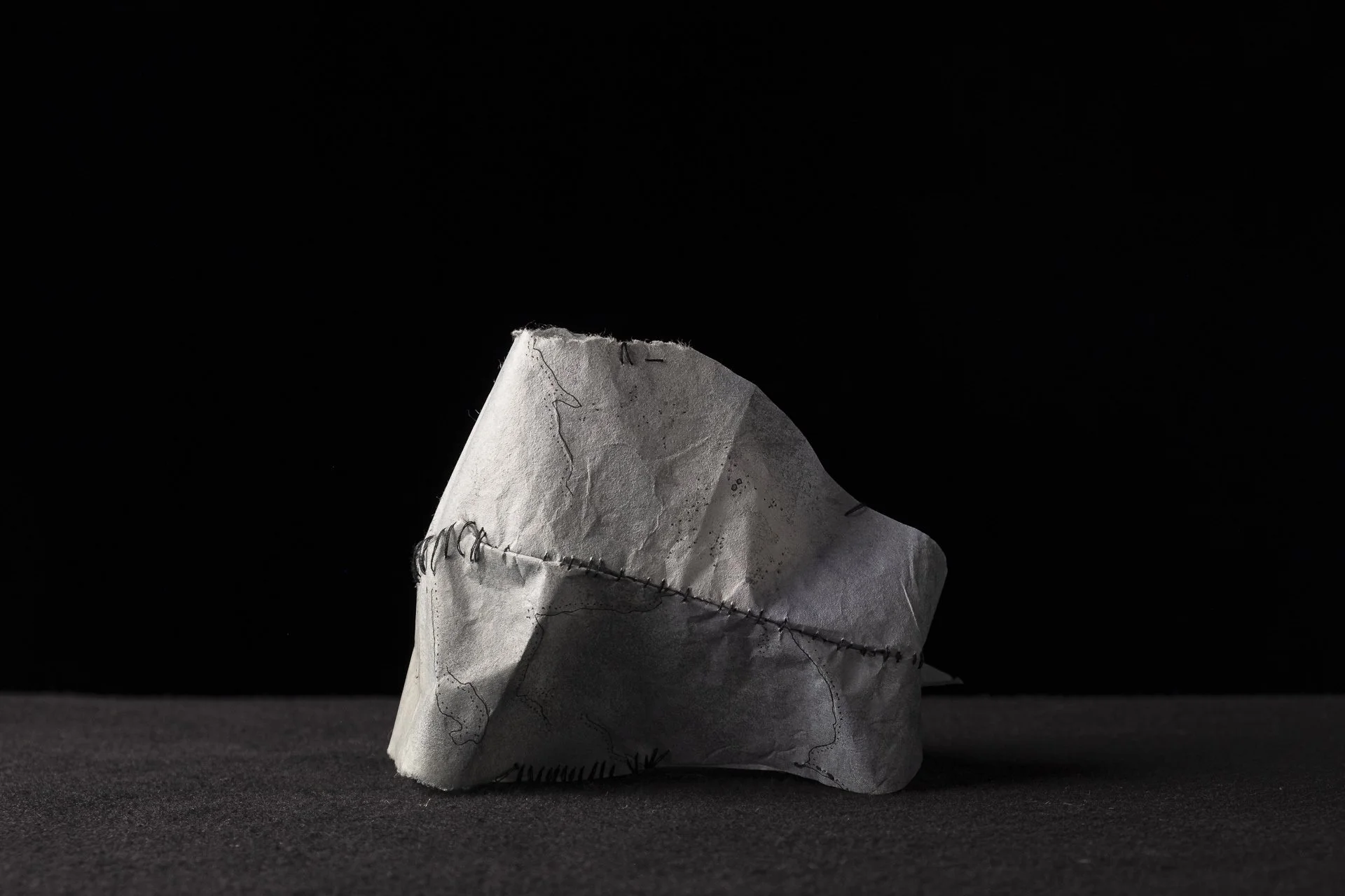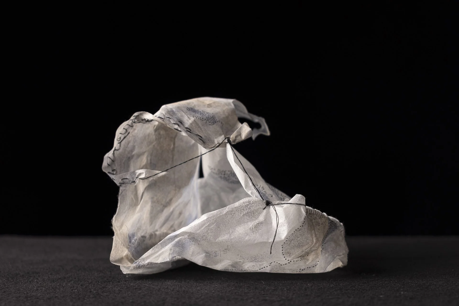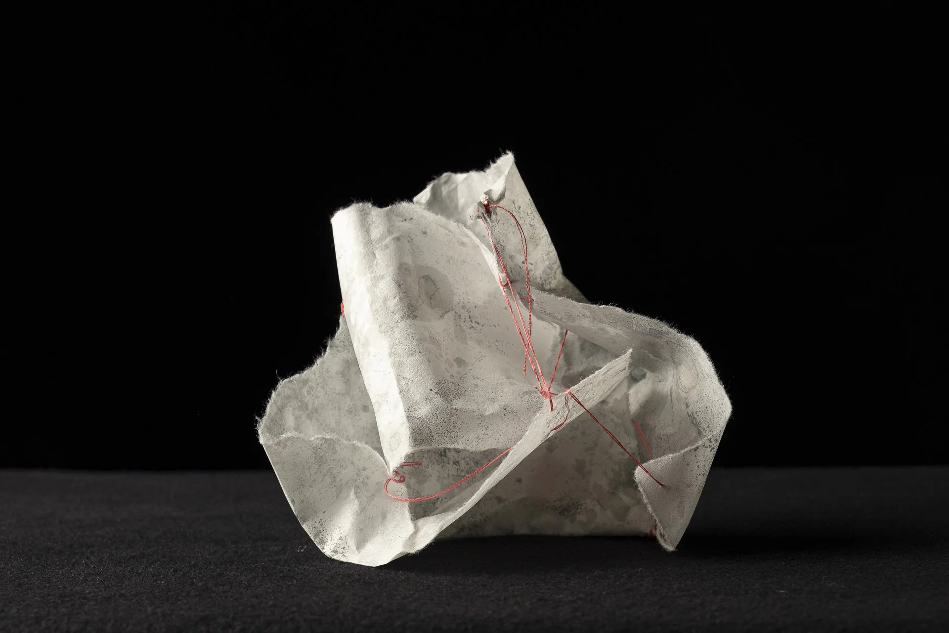 Med ömtåliga papper, tunna linjer, dimmiga färgfält och sköra trådar som ensamma håller ihop former vill jag skapa en gåtfull och förgänglig stämning. En önskan om att bjuda in människor att gå nära och stanna upp i detaljerna, som om verken snart kommer blåsa iväg eller blekna bort.